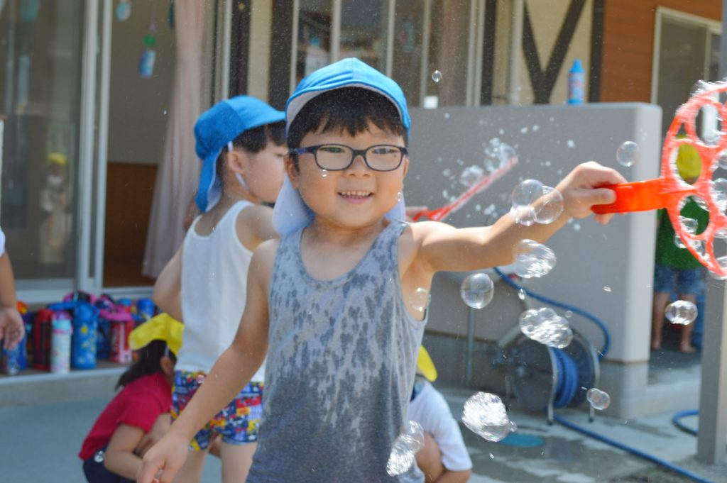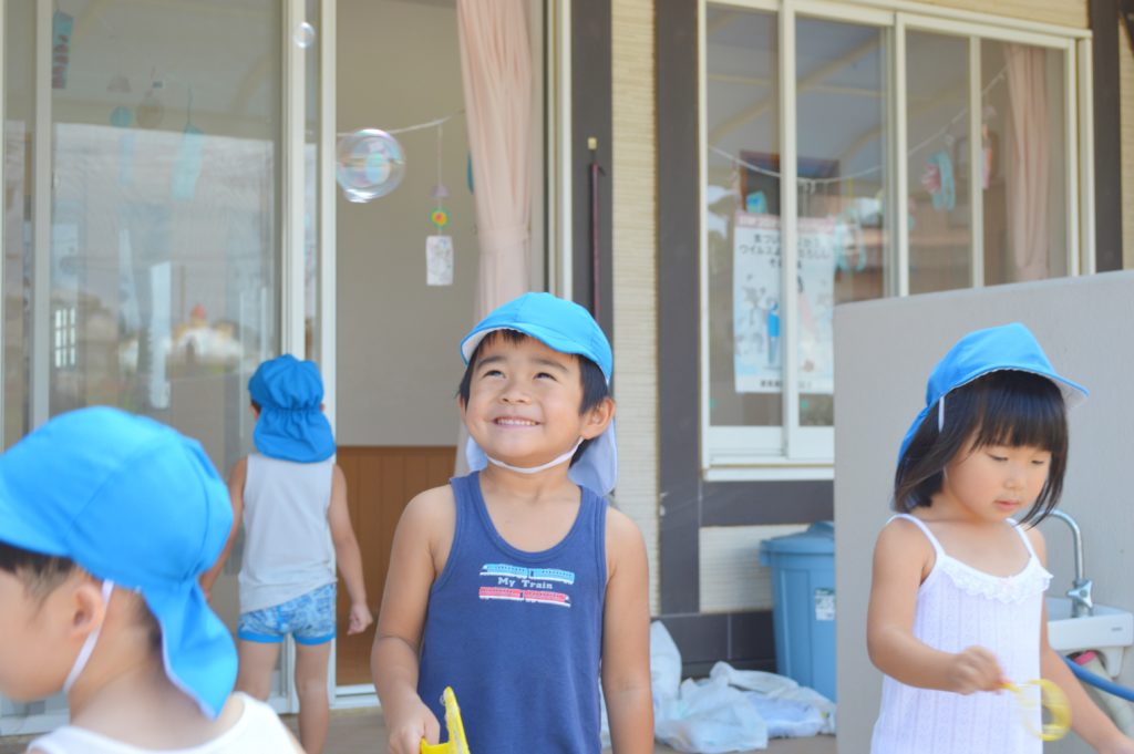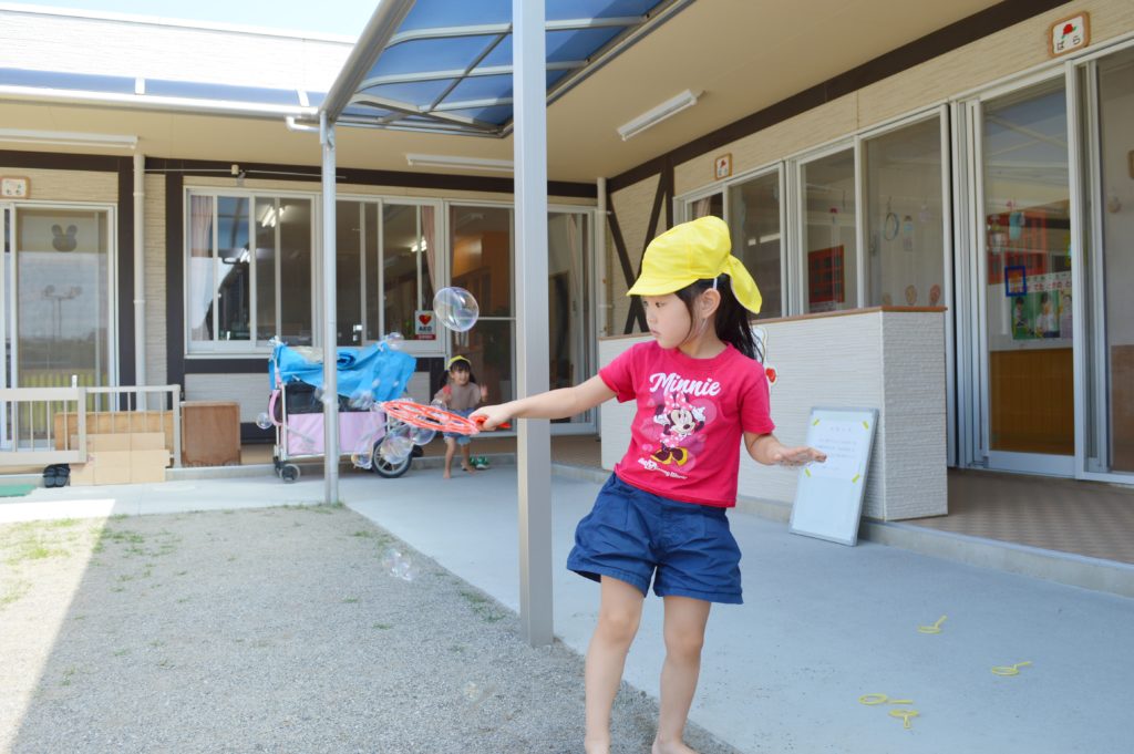 今日はお庭でシャボン玉遊びをしました♪