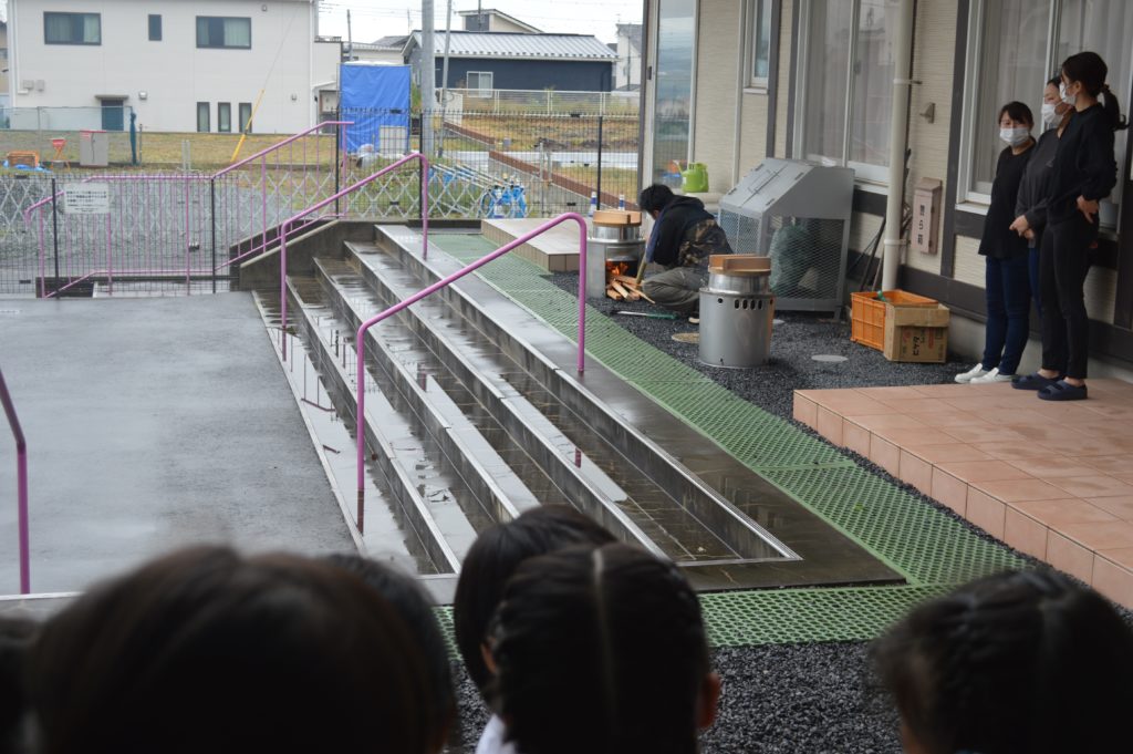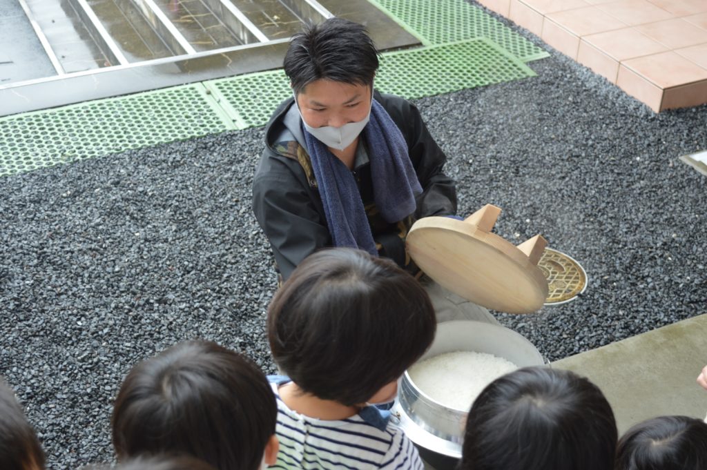 大きなお釜を使って、薪の火でお米を炊くという体験に