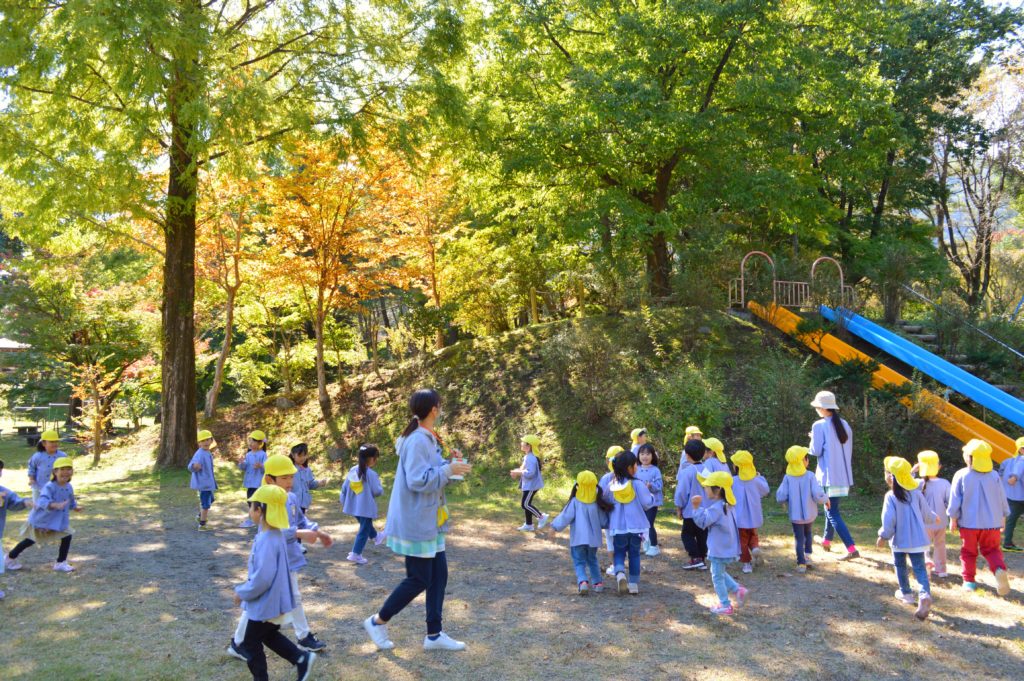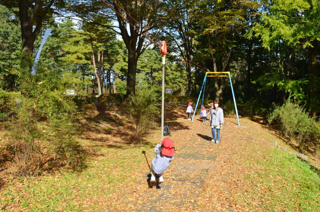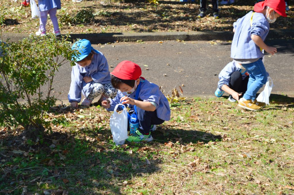 自然豊かな広い公園で、みんなでドングリや松ぼっくりを拾ったり