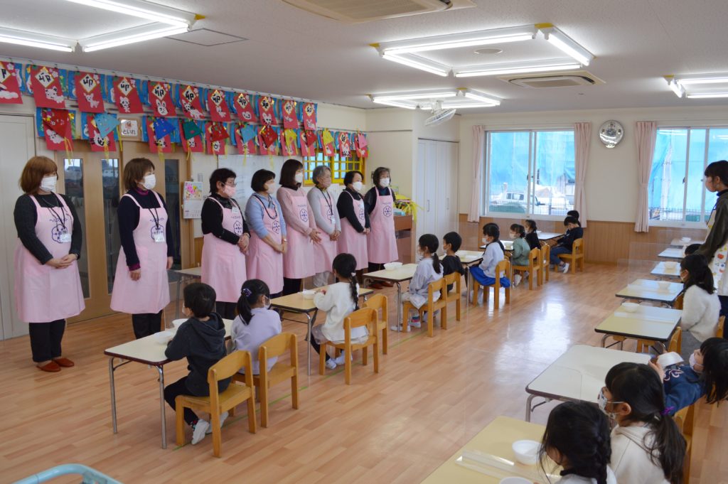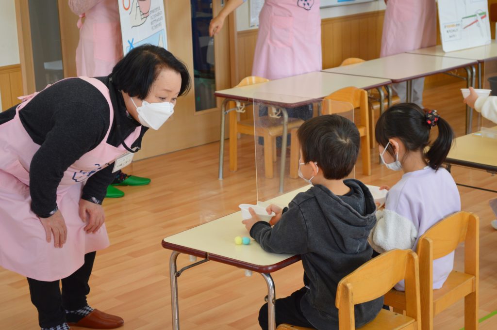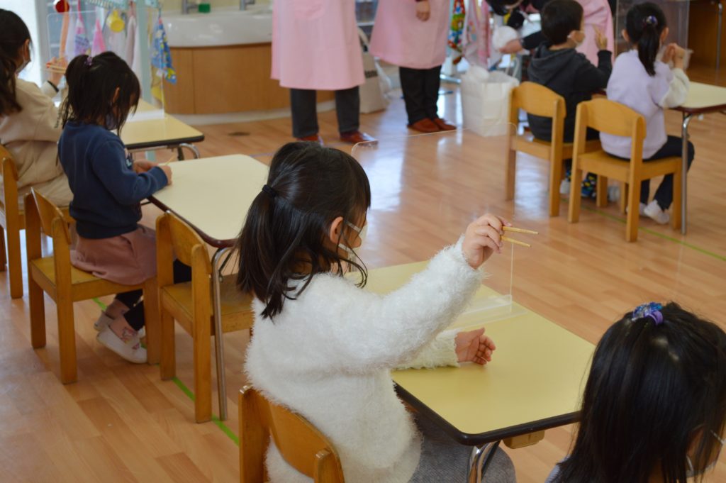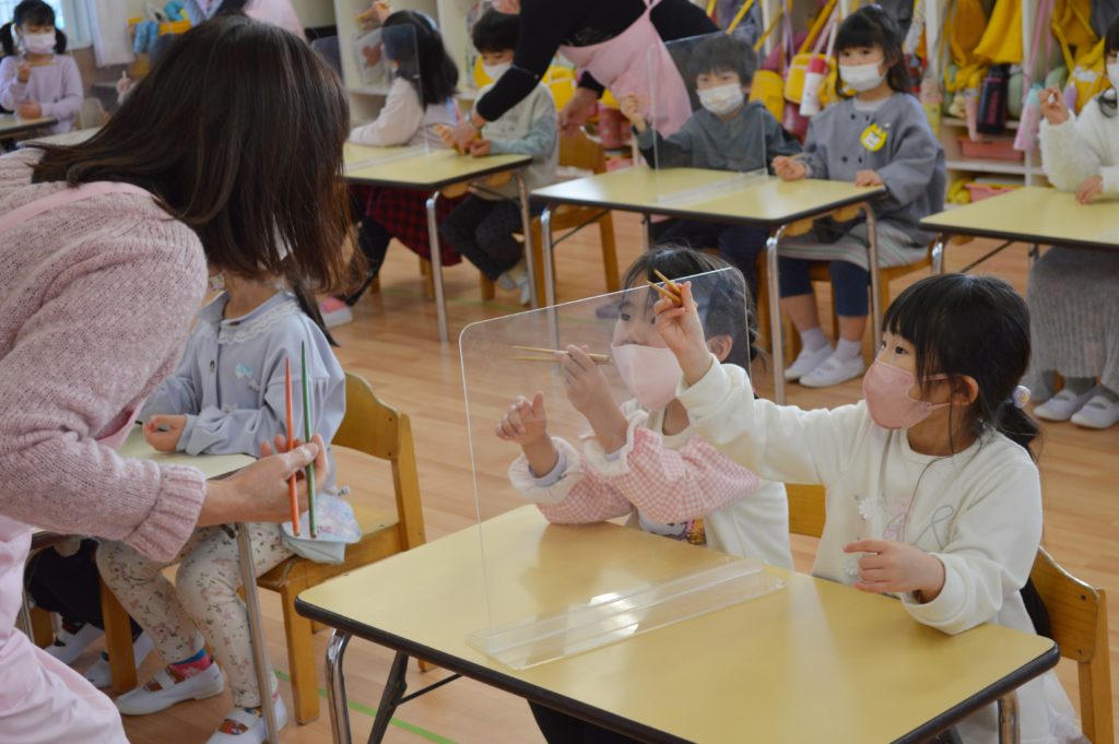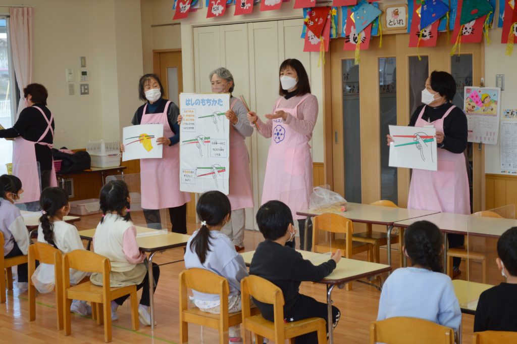箸やお椀の持ち方の練習や、体の成長に必要な食べ物などのお話をしてくれました。