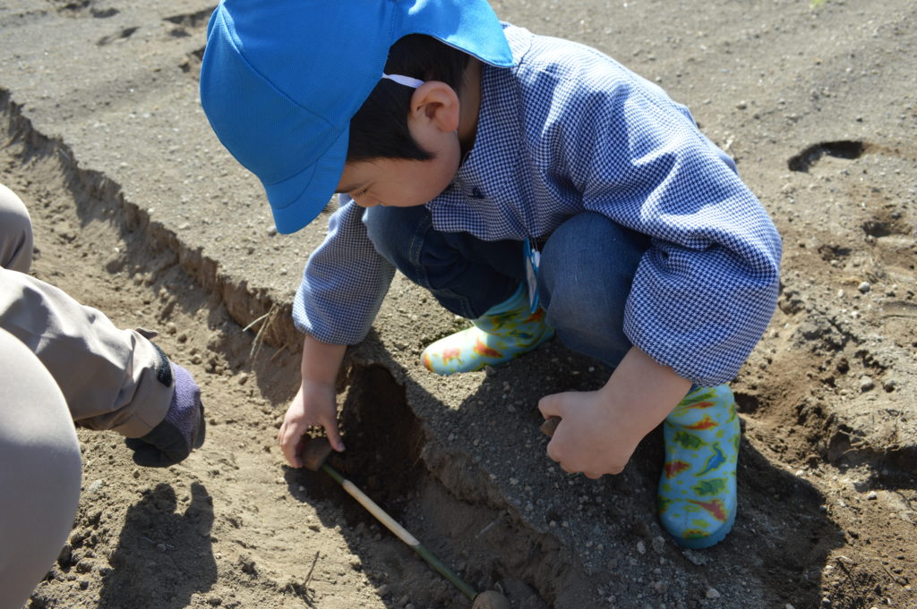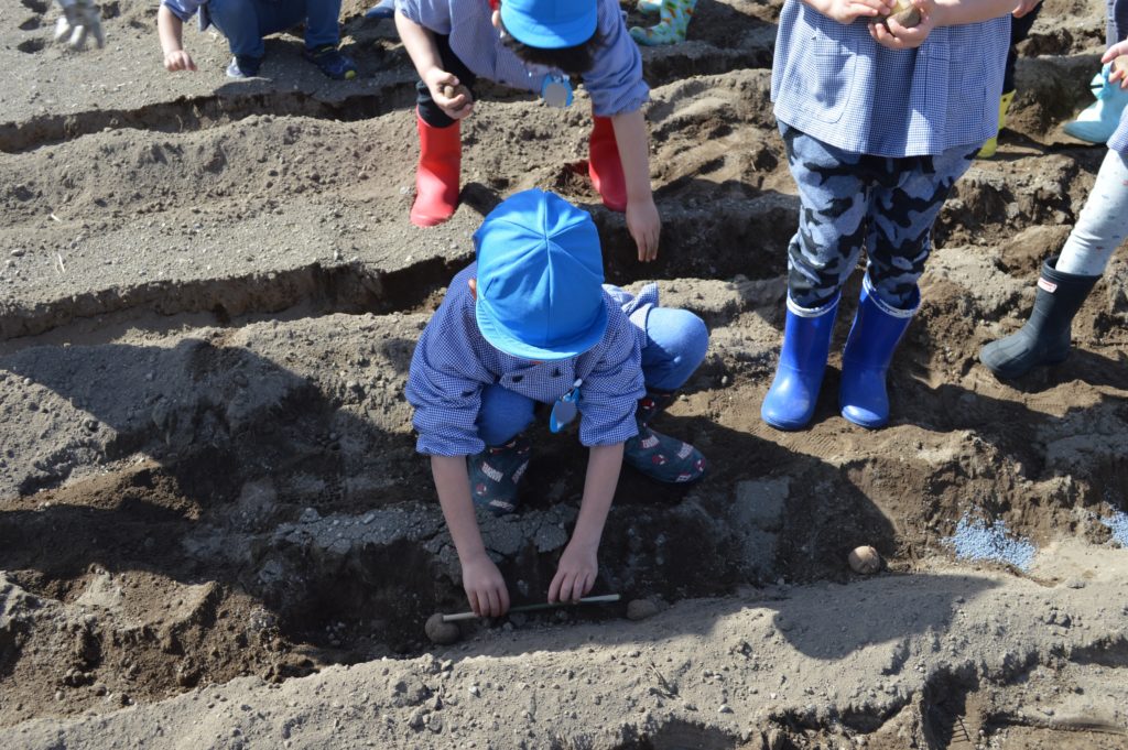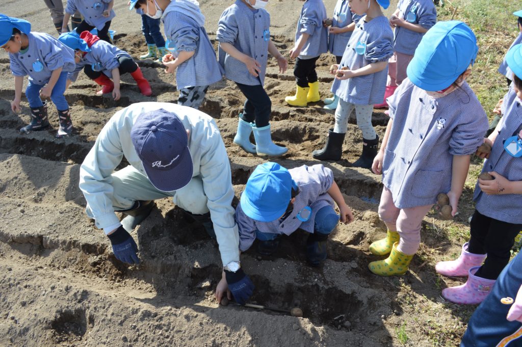 本日はすみれ組さんにじゃがいも植えをお手伝いしてもらいました。