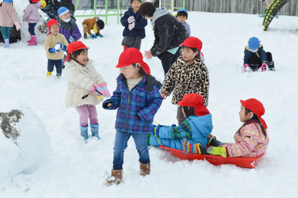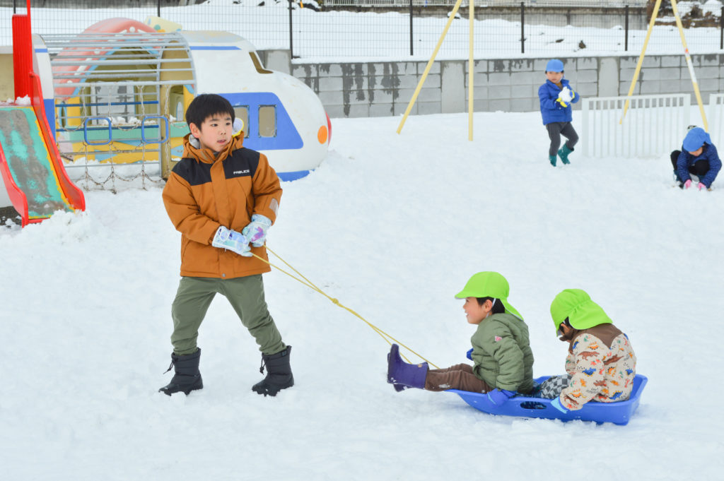 ソリに乗って雪の上を滑ったりして、みんな大はしゃぎでした♪