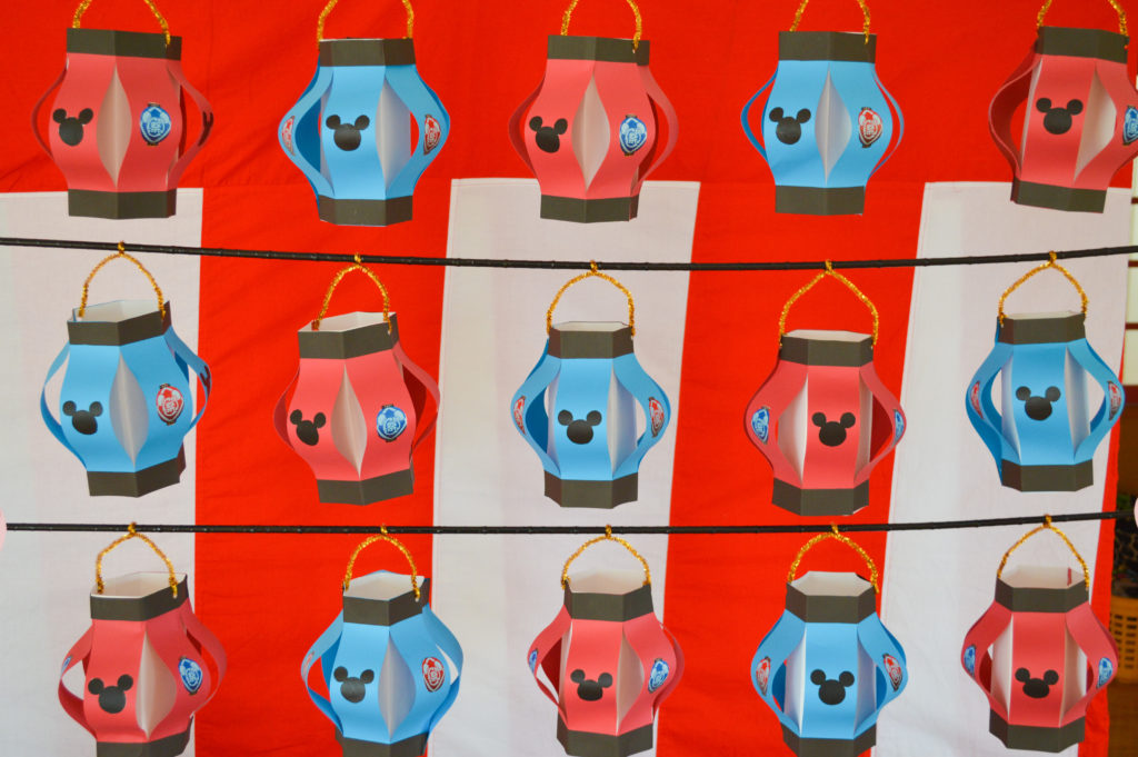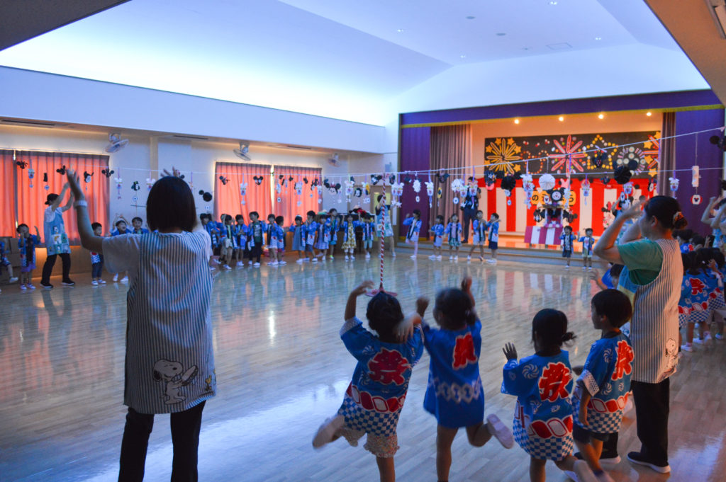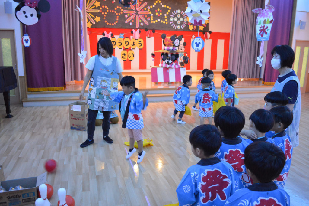 お遊戯室にお祭りの飾りつけを行い、くじ引きやおもちゃつかみの出店を作り